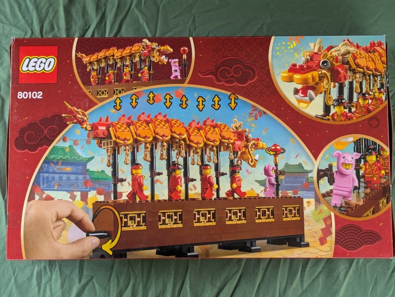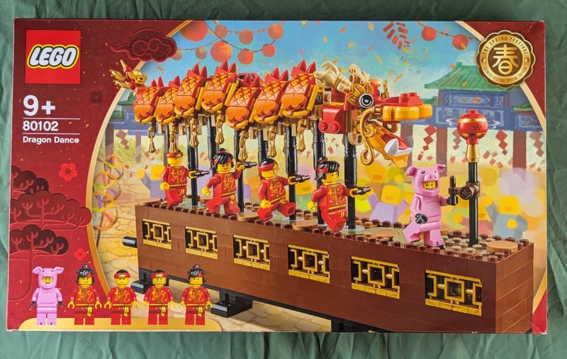 LEGO 80102 DRAGON DANCE CHINESE NEW YEAR SETLego Set 80102 Dragon Dance Featuring An Elaborate Golden Dragon Parade Float With Articulated Segments, Brown Platform Base With Decorative Gold Panels, Eight Minifigures In Traditional Red And Gold Attire, One Pink Pig Character, And Multiple Golden Lantern Decorations.Condition: Good - Refer To Images584572+328