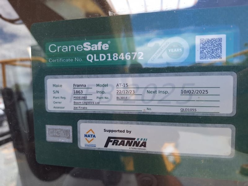2014 Franna AT-15 Crane Truck Year: 2014 Make: Franna Model: AT-15 Configuration: 8x2 Odometer Indicated: 61,022 kms Hours Indicated: 11,862 Next Inspection: 10/02/2025 Major Inspection: Engine: I6 Diesel Transmission: Automatic VIN: AT15 1863 Engine Number: 906-964-00-490045 Colour: Yellow Seats: 2 SOLD UNREGISTERED Key# M43 Carrara
