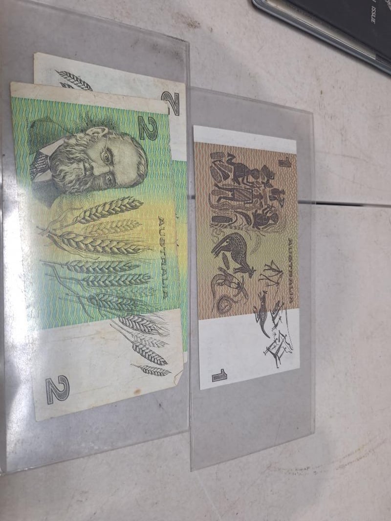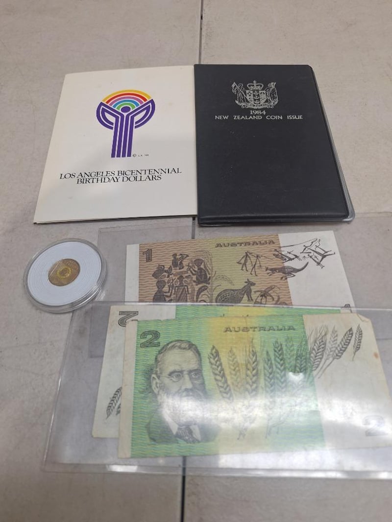 Australian paper Banknotes, $2 Dollar Matildas Established 1978 in plastic proctive case, 1 x 1984 NEW ZEALAND Coin Set in Case, 1 x LOS ANGELES Bicenntennial Birthday set in case