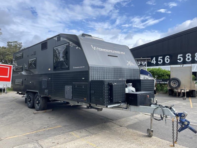 2022 Wonderland RV XTR2200 22FT Caravan Year: 2022 Make: Wonderland RV Model: XTR2200F-B3 Body: Caravan Length: 6800 mm Colour: Black Configuration: Dual Axle VIN: 6T9T21V86MAHE3133 Length Overall: 9400 mm GTM: 3600 Kg Tare: 3100 Kg ATM: 3990 Kg Description: The XTR XT2200F-B3 caravan merges luxury with practicality, featuring a north-south island queen bed with a plush pillow top mattress, ensuring comfort after a day of adventure. It excels in storage, offering a 670L tunnel boot and a 650L under-bed space, paired with an L-shape lounge that easily transforms for additional sleeping arrangements. Enerdrive B-Tec Lithium 12v 300AH Battery, Epower 2600w Inverter with AC transfer switch (refer to photos) This caravan’s design prioritises convenience and social interaction, with a straight door-side kitchen for engaging meal preparations and a space-efficient open plan bathroom, making it an ideal choice for families or groups who appreciate both style and functionality on their travels. Bedding: Caravan queen bed 1530x1880mm North-south island orientation Luxurious pillow top mattress Walkway access down each side of the bed Storage: 670L tunnel boot storage (700W x 430H x 2245D) accessible via external doors 650L under-bed storage (1100W x 450H x 1360D) accessible via gas-lift bed Mirrored wardrobes with hanging space on each side Bedside table with drawers on each side Overhead bedroom cabinets Bedroom corner cabinets Kitchen overhead cabinets, above the fridge and seating area Six kitchen drawers and an under sink cabinet Bathroom overhead and vanity cabinets Full height linen cupboard and three drawers Seating L-shape lounge with telescopic, adjustable table leg to easily change table height Swivels and slides in four directions for maximum access and comfort Convert to extra bed by lowering table and adding in-fill cushion (sold separately) Fold out footrest for comfortable lounging Bathroom: Side open plan bathroom opposite bunks Concertina door for more space Separate shower and toilet area 3kg space-saving wall-mounted washing machine Key# RA40 Lloyds Stock# 580426+1 #MMR